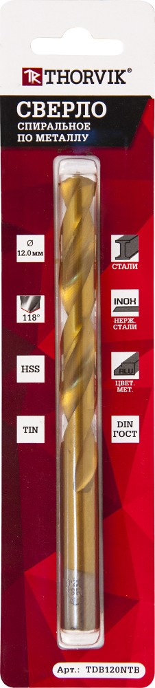 Сверло спиральное по металлу HSS TiN в блистере, d9.0 мм. Спиральные сверла по металлу Thorvik изготавливаются из быстрорежущей инструментальной стали с высоким содержанием легирующих элементов, что обеспечивает возможность обрабатывать материалы с высокой твердостью. Геометрия заточки сверл позволяет с высокой эффективностью обрабатывать большинство известных материалов, таких как чугуны, углеродистые и конструкционные стали, нержавеющие и жаропрочные сплавы. Спиральные сверла Thorvik изготовлены по стандарту DIN 338 тип N и полностью соотвествуют техническим условиям ГОСТ 10902-77. Применяется для большинства известных материалов, таких как чугуны, углеродистые и конструкционные стали, нержавеющие и жаропрочные сплавы.